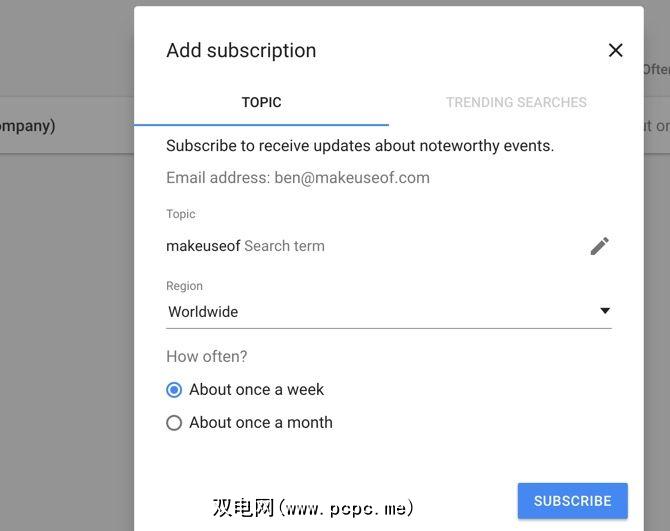 趋势搜索标签可让您注册以获取有关热门话题的通知,但订阅标签可让您订阅所需的任何字词。只需点击右下角的加图标即可。输入您感兴趣的搜索词或主题,设置区域,并指定是每周一次还是每月一次。