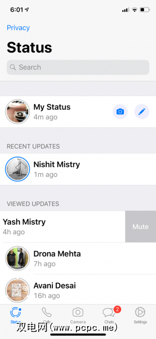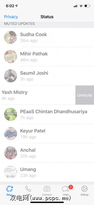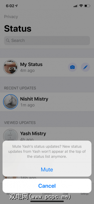 您可能不希望看到管道工在WhatsApp状态上发布了什么。静音功能可让您从Feed中隐藏联系人的状态更新。