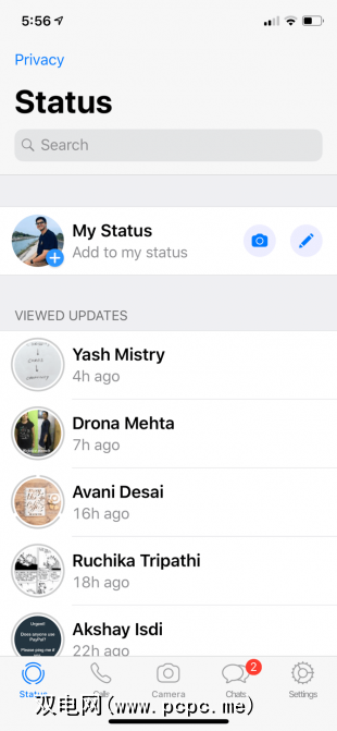 在Android上,点击顶部的“状态"标签以打开WhatsApp状态。在iPhone上,您会在应用程序底部找到“状态"标签。