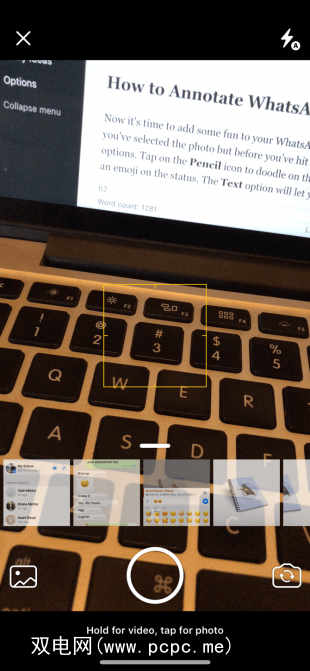 打开状态部分,然后点击顶部的添加到我的状态按钮。这将打开相机视图。如果要拍照,请点击快门按钮。要捕获视频,请点击并按住快门按钮。双击中间的两个按钮可在相机之间切换。
