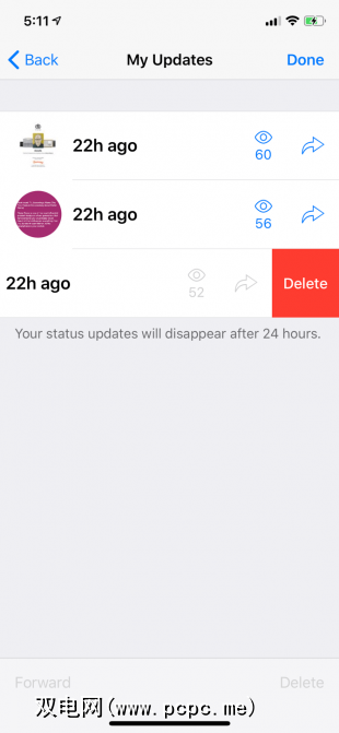 在iPhone上,点击我的状态,然后向左滑动并显示 Delete (删除)按钮。