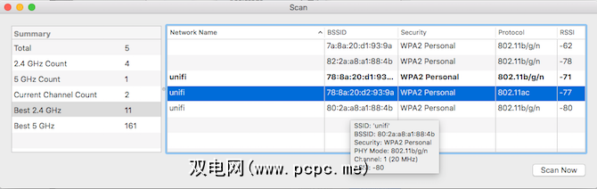 单击右下角的立即扫描。如果尚未列出网络,您应该很快就会看到它们的列表。请注意,您可以在网络列表中向右滚动以查看更多信息,例如当前频道和频道宽度。