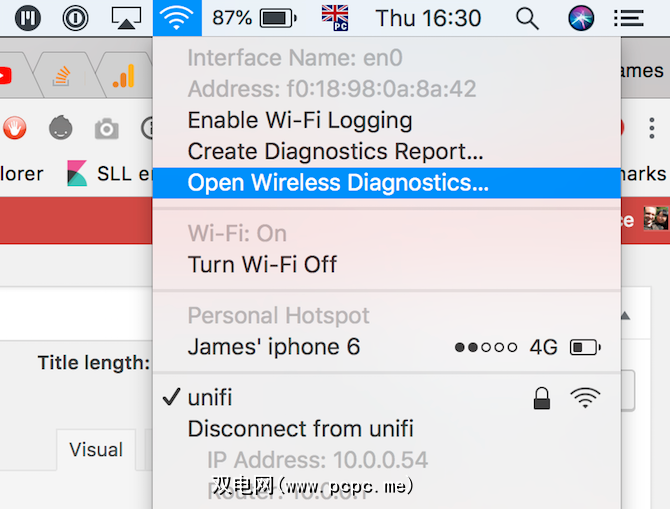 要找到它,请在单击时按住 Option 键菜单栏中的Wi-Fi图标。您应该在出现的下拉菜单中看到打开无线诊断程序。选择该名称。