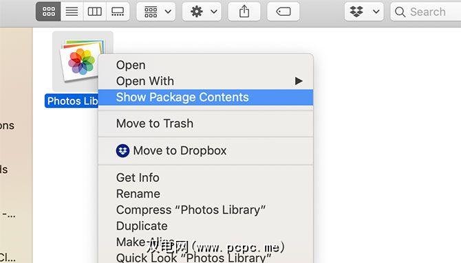 默认情况下,图片库存储在主目录下的 Pictures 文件夹中,该访问很容易。虽然访问它有点奇怪。在图片文件夹中,您会看到一个名为照片库的图标。要访问您的照片,请右键单击它,然后选择显示包内容,然后打开母版文件夹。