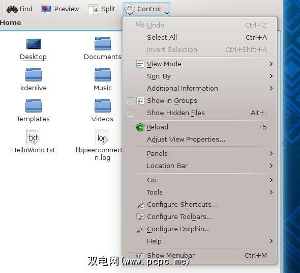 幸运的是,Dolphin将其所有可配置设置打包到一个下拉列表中菜单按钮称为“控制"。从这里,您可以轻松更改其他视图,例如启用其他信息和隐藏文件的可见性,控制面板和位置栏,以及查看可用于Dolphin的其他更深入的设置。