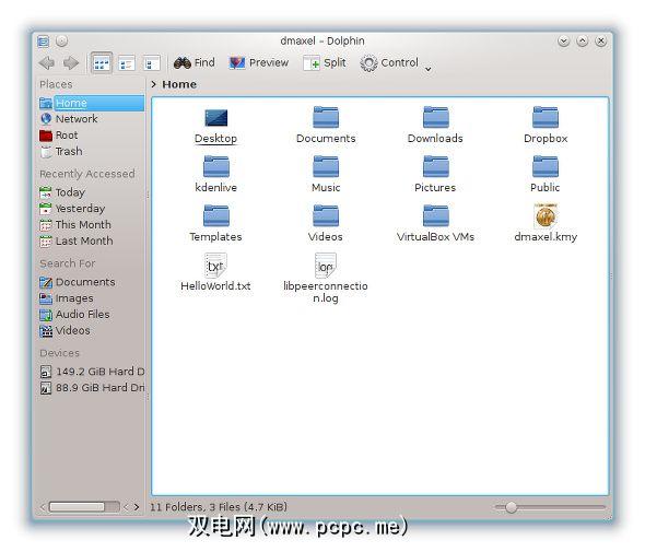Dolphin, on the other hand, follows KDE’s philosophy of placing importance on features and customizability. As such, you’ll immediately notice that the interface isn’t nearly as slim as Nautilus’s. Similarly to Nautilus, Dolphin includes a left panel of common folder destinations, as well as some buttons to customize navigation and configure other settings.