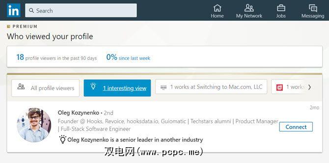 LinkedIn Premium用户在过去90天内对查看历史记录没有任何限制。页面顶部的滑块会显示访问者的来历,最常见的标题以及在LinkedIn上找到您的方式。
