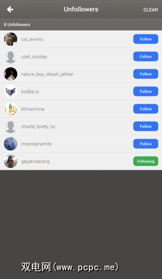 “取消关注者"列表显示单个帐户,以及您是否关注他们。轻按和帐户即可在Instagram中打开它,您可以在其中向他们发送消息或取消关注。