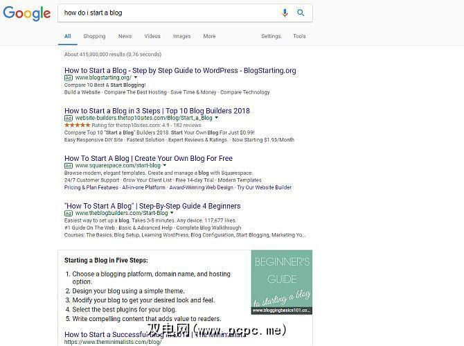 例如,当我搜索“如何创建博客"之类的内容时,您可能希望看到内容丰富的文章,这些文章将逐步引导您创建自己的博客。这将为您(用户)最好地服务。取而代之的是,您从愿意向Google支付最高费用的网站上获得了四个列表,这些网站是在搜索结果中排名第一的特权。