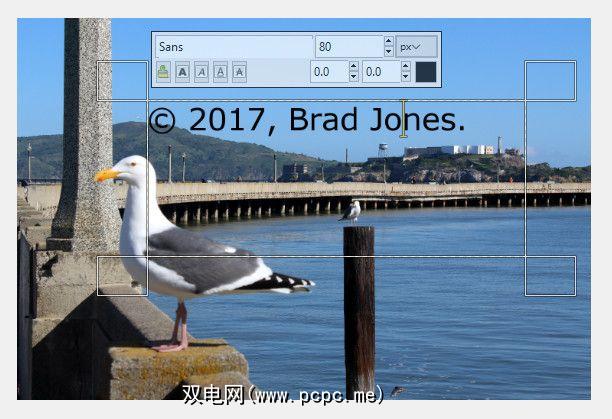 要创建版权水印,请在您喜欢的图像编辑软件中打开您的照片。我正在使用GIMP。添加带有版权信息的文本元素。