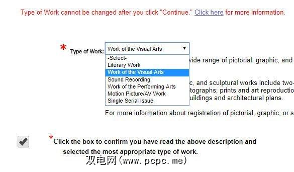 仔细阅读下一个屏幕上的三个问题,并回答它们以开始注册过程。然后,系统会要求您选择要注册的工作类型。从下拉菜单中选择视觉艺术作品。