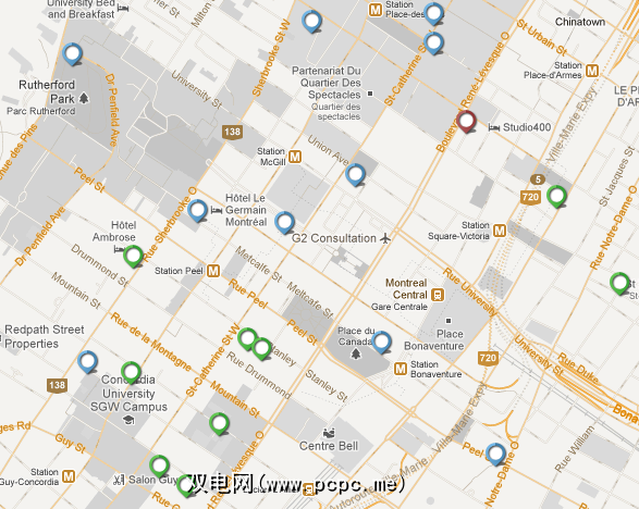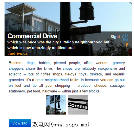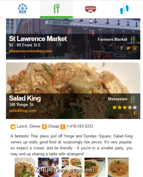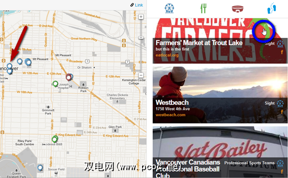 在此地图旁边,您会找到一个您在地图上看到的相同景点的直观列表。每个景点都附有一张图片或更多图片,到该地方的官方网站和社交网络的链接,一个地址,对于餐厅,则是Urbanspoon的星级。只要将鼠标光标放在这些图块之一上,地图上相应的图钉就会开始跳跃和挥舞,从而轻松将图块与图钉进行匹配。