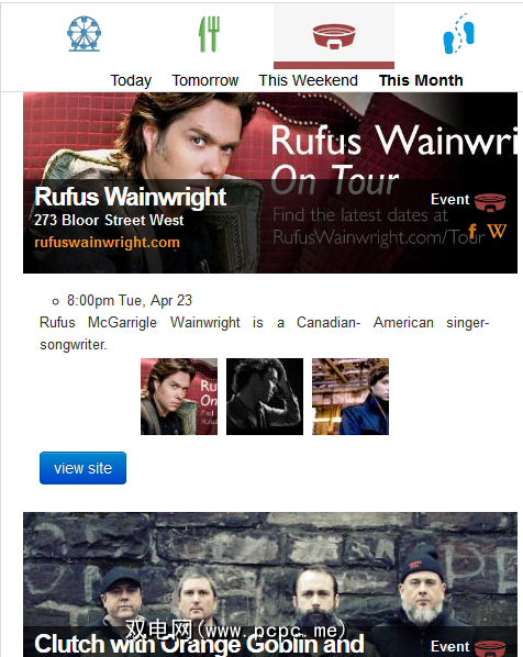 在“事件"标签中,您可以根据事件的时间过滤结果,从而轻松找到今晚和明天的活动,即将到来的周末等。在这里,您也可以在每个图块中找到所有必要的信息,并具有指向Wikipedia页面和Facebook页面的快速链接,场所地址等。