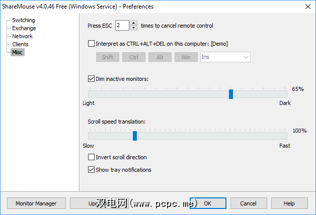 ShareMouse具有一些很酷的功能。我特别喜欢的一种功能是使不使用的显示器变暗。这是对鼠标当前潜伏在屏幕上的一个很好的提醒,但是如果您不充电,也可以帮助保留宝贵的笔记本电脑电池寿命。