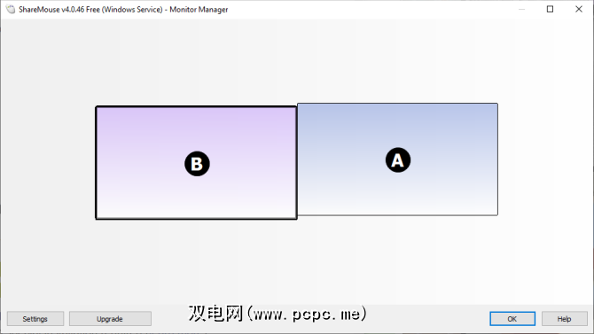 您可以使用Monitor Manager来告诉ShareMouse您的显示器在彼此之间的位置。 Monitor Manager使用简单。只需将显示器拖放到正确的位置即可。在移动屏幕时,ShareMouse会在每个屏幕上显示监视字母,因此您知道是哪个。
