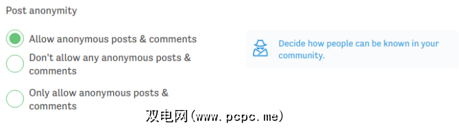 例如,其中一项选择使我可以选择是否允许匿名帖子。 ,但不仅如此-有可能建立一个仅允许匿名帖子的社区。显然也存在有关该组隐私的其他标准设置。
