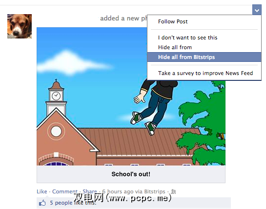 当您看到Bitstrips条目时,请点击右上角的箭头,然后选择“隐藏所有来自Bitstrips"。它应该与其他所有人的Bitstrip一起消失。