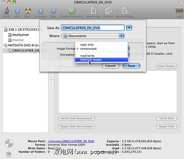 要在另一台Mac OS X计算机上执行此操作,请插入CD或DVD并从 Applications-中打开 Disk Utility 应用程序- >实用程序。在左侧边栏中选择光学介质,然后选择文件->新建->光盘名中的磁盘映像。从图像格式下拉菜单中选择 DVD / CD Master ,选择一个位置,然后按 Save 。最后,将图像文件通过本地网络或使用便携式驱动器复制到MacBook Air,然后双击将其安装到计算机上。