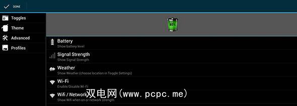 You get the idea – add a widget and configure how it looks. There are more options on the right – Toggles, Theme, Advanced, and Profiles. Toggles is where you’ll spend most of your time, setting up your widget. Theme, logically enough, allows you to change how the widget looks – mainly by adding a background and making it transparent. Profiles allows you to save a widget, perfect if you want to remove a given widget for now but feel you might want it later.