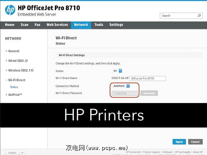 此问题并非Wi-Fi Direct独有。确实,这是物联网设备的普遍缺陷。在安德烈斯·布兰科(AndrésBlanco)在黑帽欧洲(Black Hat Europe)展示的众多示例中,有惠普和三星的打印机以及Western Digital的媒体流设备。以OfficeJet Pro 8710为例。打印机支持Wi-Fi Direct,并且还可以接受与标准Wi-Fi网络的并发连接。打印机的安全管理包括: HTTPS,WPA2、802.1x无线身份验证,PSK和防火墙等。