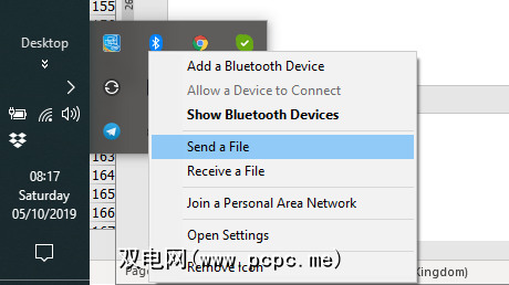 成功配对后,切换到Windows桌面,然后在系统任务栏/通知区域中找到Bluetooth图标。左键单击并选择发送文件;将提示您选择目标设备,然后浏览文件。