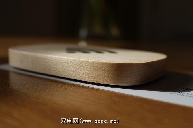 与许多优雅的设计一样,该设备看上去也很朴素。机身由硬枫木制成,顶部带有简约的Wi-Fi符号。底面有一个可移动的塑料盖,您可以在其下添加六个随附的图形插件之一来个性化设备。