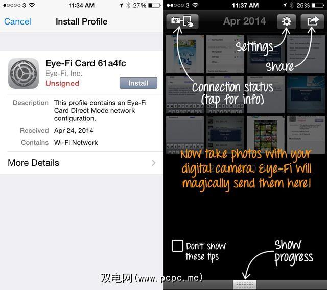 至少通过使用设备配置文件,可以更轻松地在Eye-Fi上设置直接模式WiFi连接。在iOS上。有两个按钮,第一个按钮将WiFi配置文件下载到您的手机,第二个按钮复制密码以访问它。奇怪的是,只有在有照片要上传时,网络才会广播,因此,如果您在连接时遇到问题,只需在相机上拍摄一些照片即可初始化。