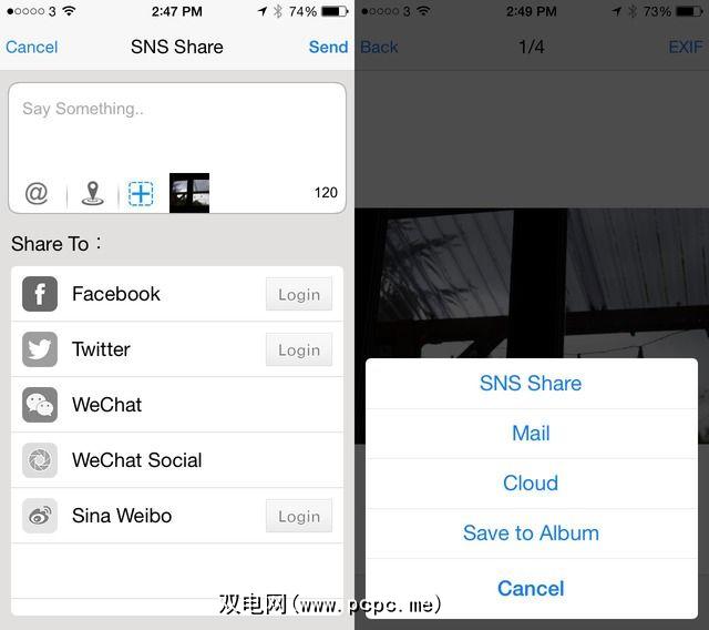 像创见一样,无法自动上传到PC,但是您可以为手机启用“自动推送"功能。如果您的PC配备了WiFi,您仍然可以通过浏览器直接连接到存储卡并以这种方式下载图像。 Autopush的效果相当好-图像传输速度似乎很快,很快就被自动添加到内部相册中。不过,我要指出的是,这与您的“照片"应用不同–如果要在系统范围的相册中使用它们,则需要进一步的手动操作。奇怪的是,查看图像和进入编辑模式后显示的共享对话框完全不同:后者包括Facebook和Twitter之类的选项,但不包括电子邮件,而前者包括电子邮件并保存到“云"(不是iCloud,我可能会添加,但有其他服务可供选择。)
