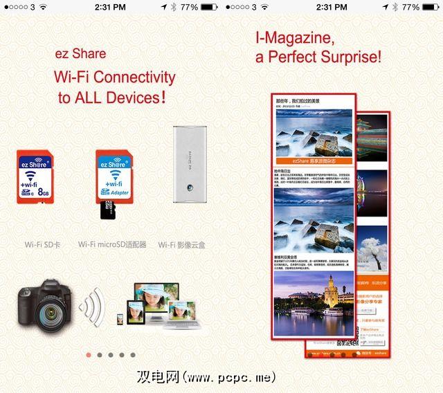 首次启动EZ Share iOS应用程序时,您会收到教程屏幕和促销的奇怪组合。我仍然不确定iMagazine应该是什么,但是我所看到的只是一系列中文博客文章,实际上都无法读取,因为当您连接到SD卡的WiFi时,您的