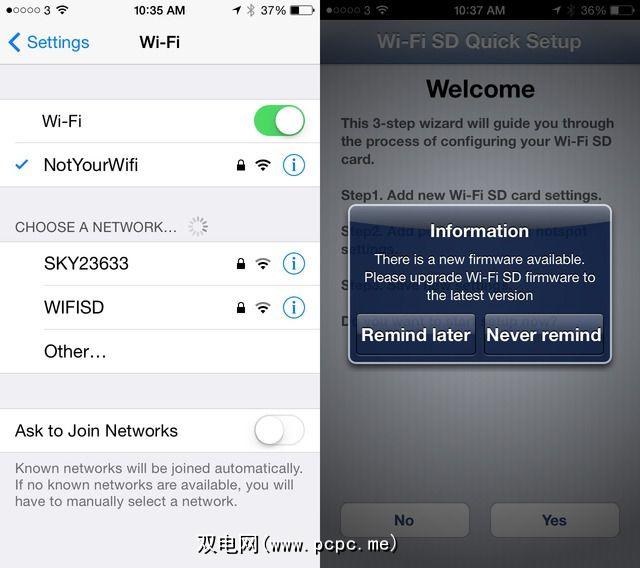 设置卡的步骤包括下载iOS或Android应用程序,并连接至卡广播的默认网络。启动应用程序后,您将进入初始设置过程。在我的情况下,我被告知需要更新固件,但是只选择了“稍后提醒"或“永不提醒"。令人失望的是,没有按钮可以真正启动升级。