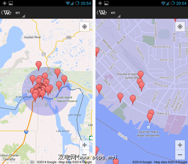 显示附近条目的地图。是的,Wikipedia的移动网站上也提供了类似的功能,但有几个主要区别:该网站以排序列表而不是地图的形式显示结果,并强制使用您的当前位置