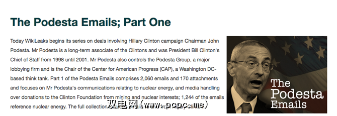 2016年10月7日,WikiLeaks开始发布来自希拉里·克林顿竞选主席John Podesta帐户的电子邮件。这些可能会与DNC电子邮件混淆,但它们却截然不同。重要的是Podesta参与竞选,而不是“中立"的促进伙伴。他还曾与克林顿(Clinton)保持着长期联系,曾担任(比尔(Bill)克林顿政府)的工作人员。