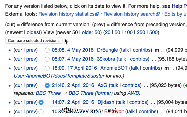 要查看某人对该页面进行的编辑,您需要比较列出的两个版本。选择其中一个修订版本旁边的左单选按钮,然后选择一个更高版本修订旁边的右单选按钮,然后单击页面顶部的比较所选修订,以查看所做的更改。