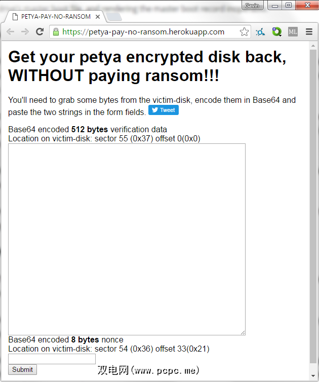 Wosar的工具提取了所需的512字节Petya裂纹,“从偏移量为0的扇区55(0x37h)开始,与扇区54(0x36)的偏移量为8个字节的随机数:33(0x21)。"提取数据后,该工具会将其转换为必要的Base64编码。然后可以将其输入到petya-no-pay-ransom网站。