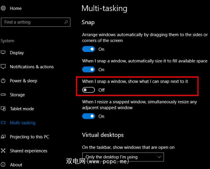 将窗口移动到屏幕的一侧后, Windows将使用其他打开的程序的图标填充另一侧。这样做的想法是,如果您固定了一个窗口,则可能希望将另一个窗口固定在它旁边。但是有些人觉得这很烦人。幸运的是,您可以在“设置"应用中将其禁用。