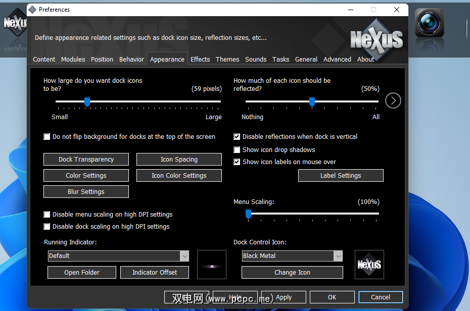 您可以在外观选项卡上为 WinStep Nexus Dock 配置图标大小和透明度。向左或向右拖动该选项卡上栏的滑块以缩小或扩大图标大小。