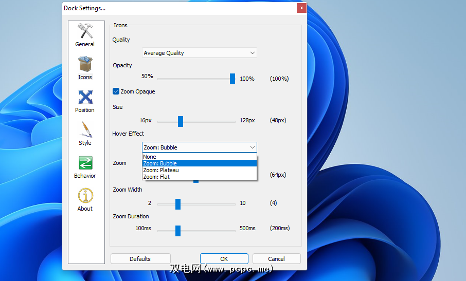 您还可以通过选择“图标”选项卡来自定义停靠栏的图标。单击此处的悬停效果下拉菜单以选择不同的缩放效果。左右拖动大小栏的滑块,使图标变小或变大。您还可以通过拖动不透明度栏的滑块来增加或减少图标透明度。