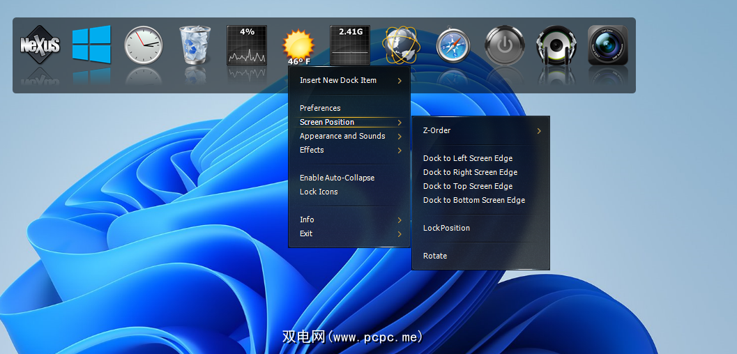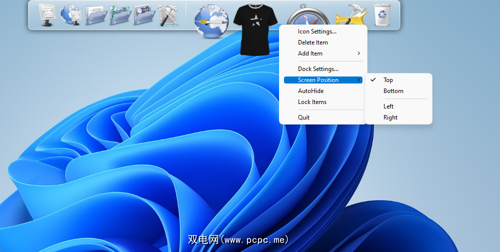 RocketDock 默认位于桌面顶部。通过右键单击 RocketDock 并选择屏幕位置,您可以像 WinStep Nexus Dock 一样更改其位置。然后在子菜单上选择Top、Left、Bottom、Right。