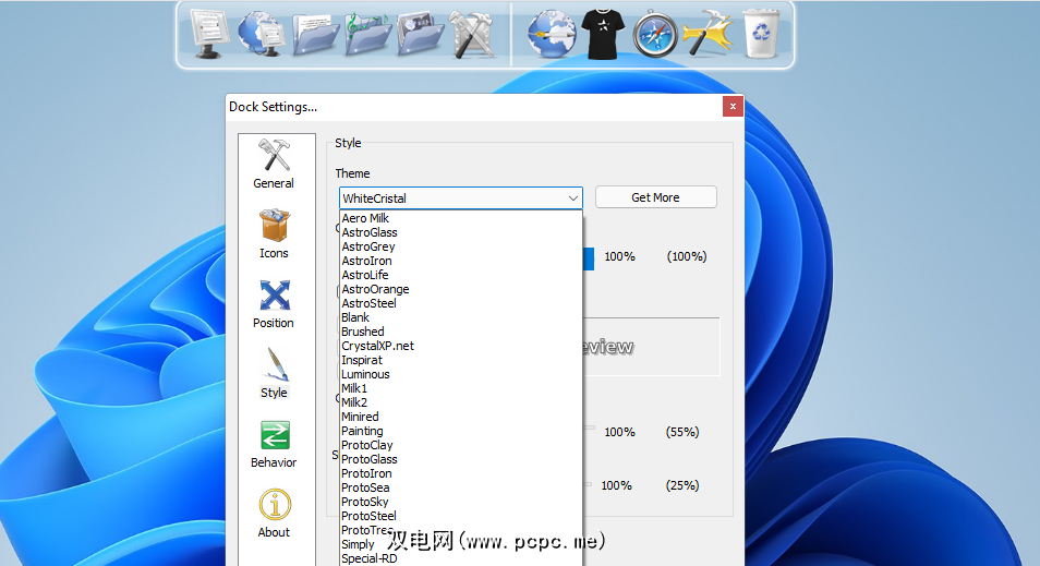 和 WinStep Nexus 一样,RocketDock 有多种不同的主题风格供你选择。要选择不同的,请单击RocketDock 上的Dock Settings按钮。单击打开的 Dock 设置窗口左侧的样式选项卡。在那里您可以通过单击主题下拉菜单来选择其他样式。