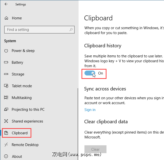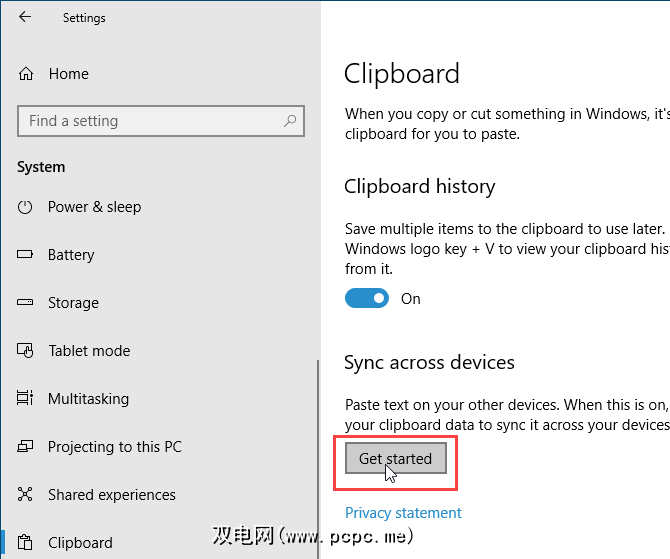 使用Microsoft帐户登录Windows 10后,请转到开始菜单>设置>系统>剪贴板,然后单击获取已在跨设备同步下开始。