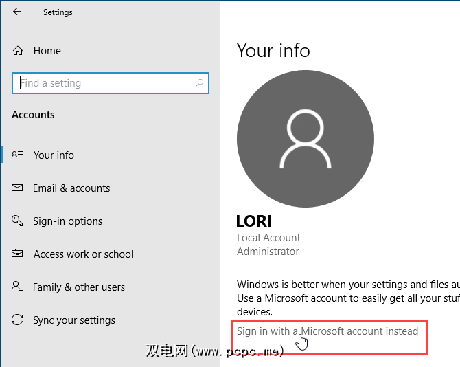 如果您的Windows帐户当前是本地帐户,请转到开始菜单>设置>帐户>您的信息,然后单击使用Microsoft帐户登录。