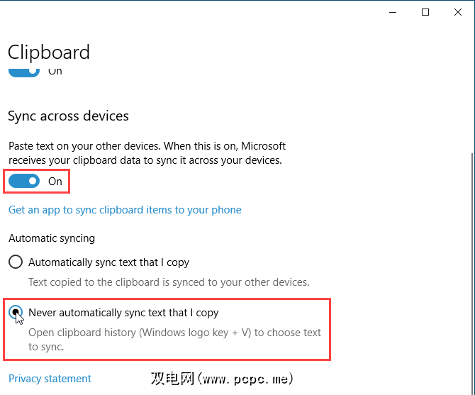 默认情况下,所有剪贴板项目均在设备上同步(自动同步下的我复制的文本)。如果您有时复制敏感数据,则可能需要选择从不自动同步我复制的文本。这样,您的敏感数据就不会上传到您的Microsoft帐户。