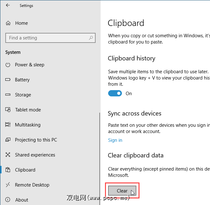 转到开始菜单>设置>系统>剪贴板,然后单击下的清除 >清除剪贴板数据。