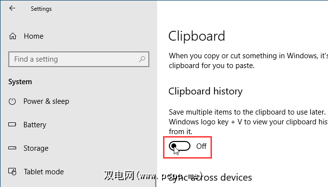 要在设备间同步剪贴板项目,请单击“在设备间同步"下的滑块按钮,使其变为蓝色并显示 On 。