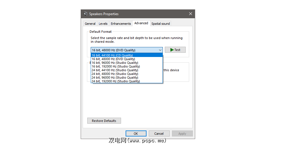注意:将默认格式更改为不同的值将允许您测试多个频率。列表中的任何格式都可以解决音频噼啪声问题。所以,把它们都试一试。