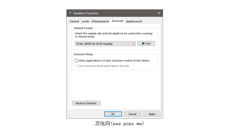 Windows 的独占模式允许应用程序在运行时对音频设备进行特殊控制。您连接的设备可能与当前设置不兼容,从而导致您的音频发出噼啪声。