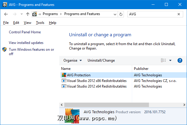 执行系统搜索卸载程序并选择相关结果。从列表中选择您的防病毒软件,然后单击卸载/更改。遵循向导的说明,然后重新启动系统。