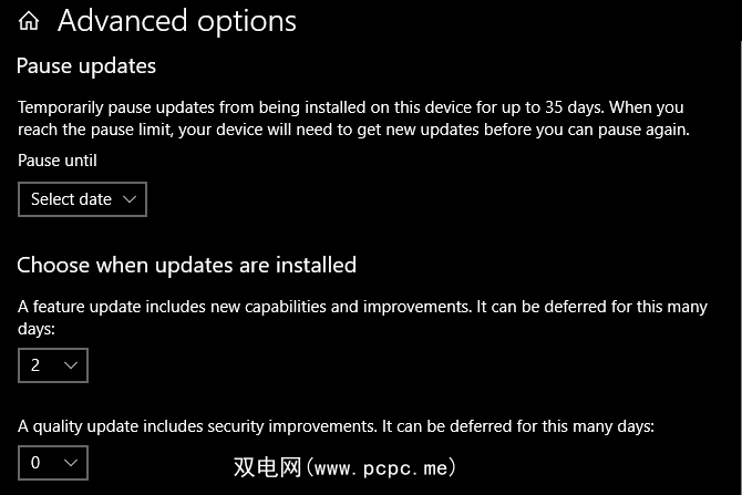如果要阻止以后安装功能更新,请访问设置>更新和安全性。 > Windows Update ,然后选择高级选项。在选择何时安装更新下,更改功能更新... 下的框,将其推迟几天。最大值为 365 。