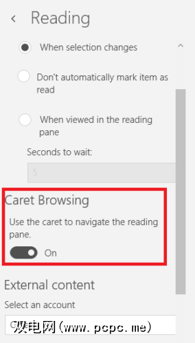您会在“阅读"菜单中找到该选项(设置>阅读)。只需切换滑块,您就无需在应用程序中触摸鼠标。 箭头键在邮件之间导航,而 Page Up 和 Page Down 在邮件正文中滚动。