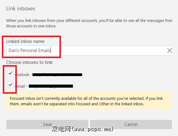 要创建链接的收件箱,请点击右下角的齿轮图标,然后转到管理帐户>链接的收件箱。给新的分组命名,并标记要包括的地址旁边的复选框。准备就绪后,点击保存。
